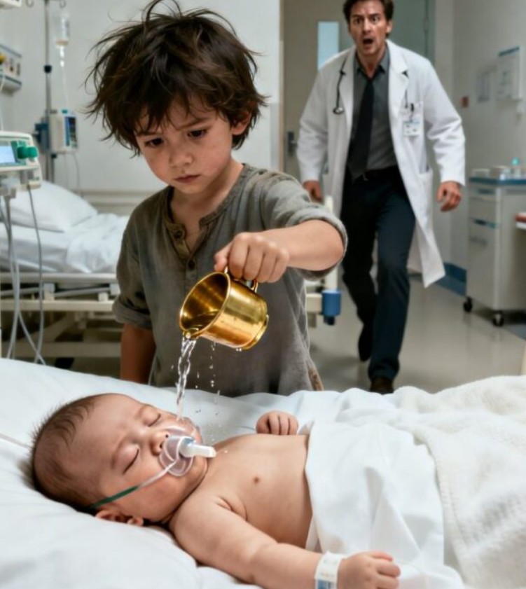 Kesken tämän surullisen hiljaisuuden, vanhoihin vaatteisiin pukeutunut koditon lapsi ilmestyi teho-osaston ovelle, kukaan ei tiennyt miten hän oli sinne päässyt. Turvallisuushenkilöstön ja lääkäreiden hämmentyneiden katseiden alla hän lähestyi hiljalleen vauvan sänkyä. Taskustaan hän kaivoi esiin ikivanhan metallikupin kirkasta nestettä ja kaatoi sitä varovasti vauvan rintaan. Hetkessä kaikki huoneessa tunsivat, että he olivat todistamassa loogisuuden yli menevää ihmettä.
