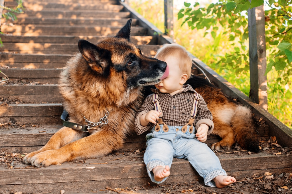 Saksanpaimenkoira korin kanssa, jossa vauva.