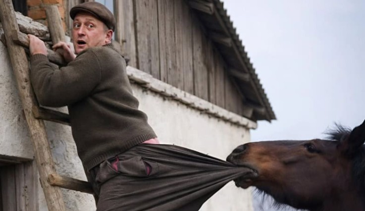 Zinaida istui pihalla jakkarallaan ja nauroi katketakseen miehensä epätoivoiselle tilanteelle tikkailta roikkuessaan. Fedor yritti pelastaa housunsa ja huusi: “Älä naura, auta!” Naapuritkin olivat kerääntyneet aidan taakse katsomaan tätä koomista näkyä. Buyan jatkoi vetämistä kuin olisi luvannut suojella isäntäänsä suurelta virheeltä, tukien jalkansa maahan.